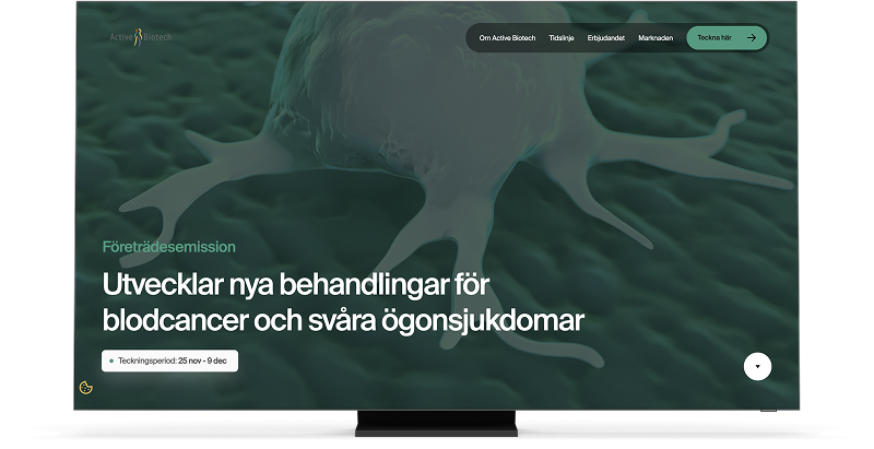 För Active Biotech ansvarade vi för strategi, paketering och digitalt genomförande i samband med bolagets företrädesemission, som tecknades till cirka 82,8 % och tillförde bolaget omkring 70,3 MSEK före emissionskostnader.